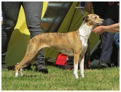 Bitch, born 27.2.2014 (picture - 3 years) redbrindle with white markings Maya in official database of Finnish Kennel Club